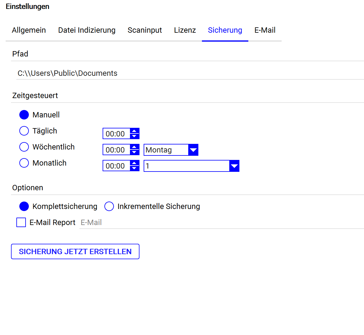 ![]() 4. Nun können Sie einstellen, ob eine komplette oder inkrementelle Sicherung erzeugt wird. 5. Klicken Sie nun auf Sicherung jetzt erstellen. Hinweis: Sollten Sie die Option E-Mail Report auswählen, erhalten Sie unmittelbar nach dem Erstellen des Backups einen Bericht, sofern die erforderlichen Mail-Server-Informationen im Reiter E-Mail korrekt erfasst sind. Diesen Bericht erhalten Sie sowohl bei einem erfolgreichen wie auch bei einem fehlgeschlagenen Backup. |