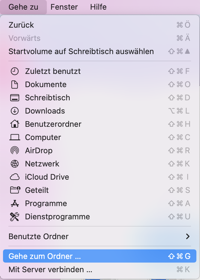 Klicken Sie in der Menüleiste auf Gehe zu und anschließend auf Gehe zum Ordner ... .