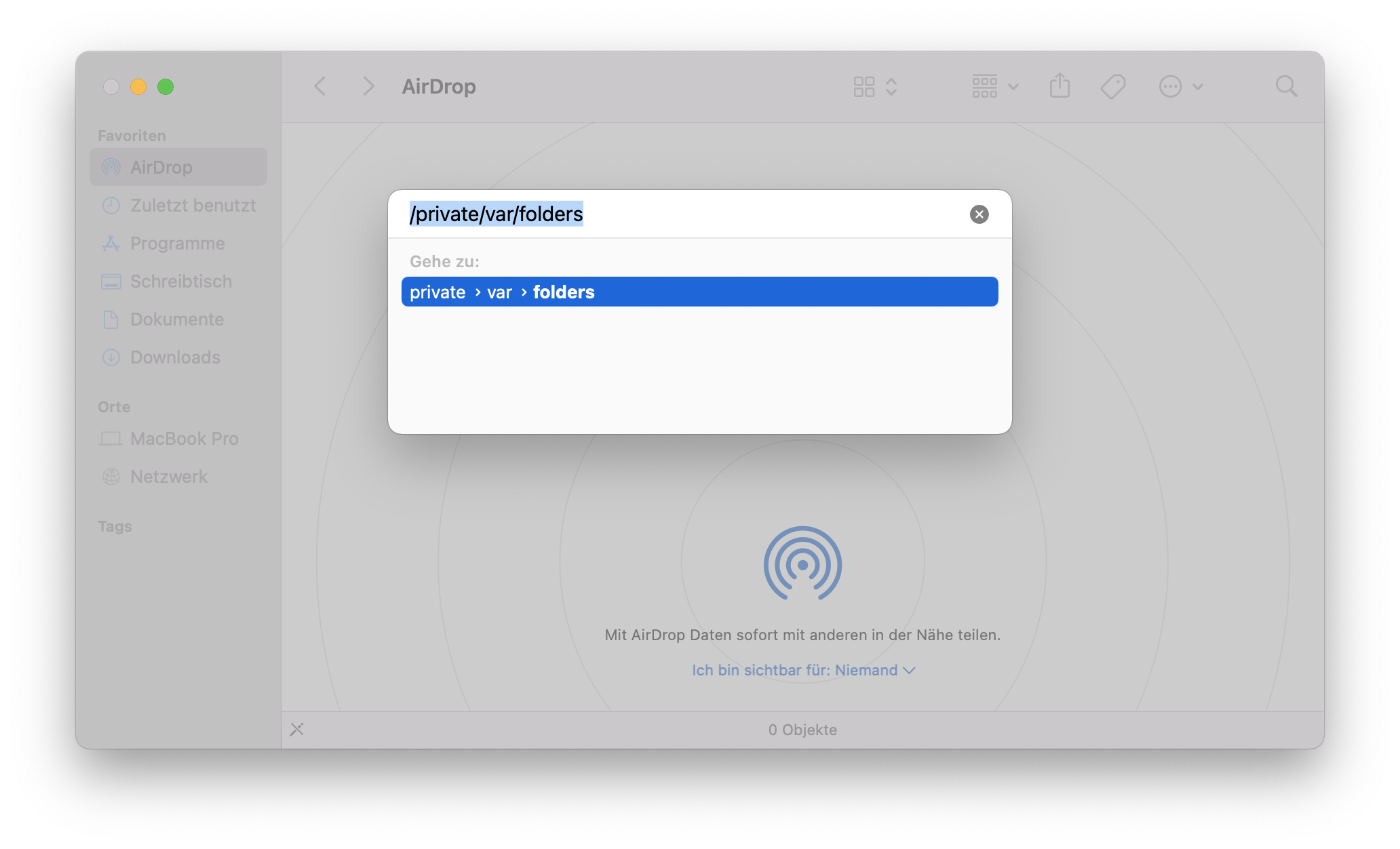 Geben Sie nun in der Suchleiste "/private/var/folders" ein und drücken Sie die Enter Taste.