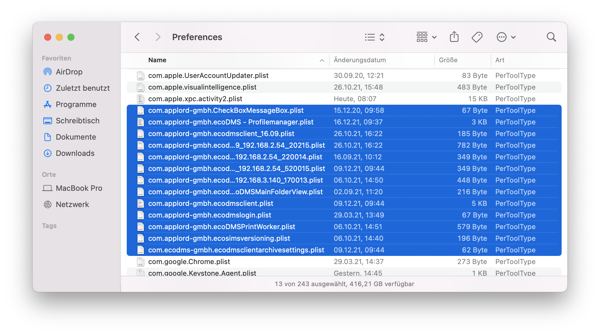 Suchen Sie nun die Dateien heraus, die entweder applord oder ecodms im Namen haben, und verschieben diese in den Papierkorb.