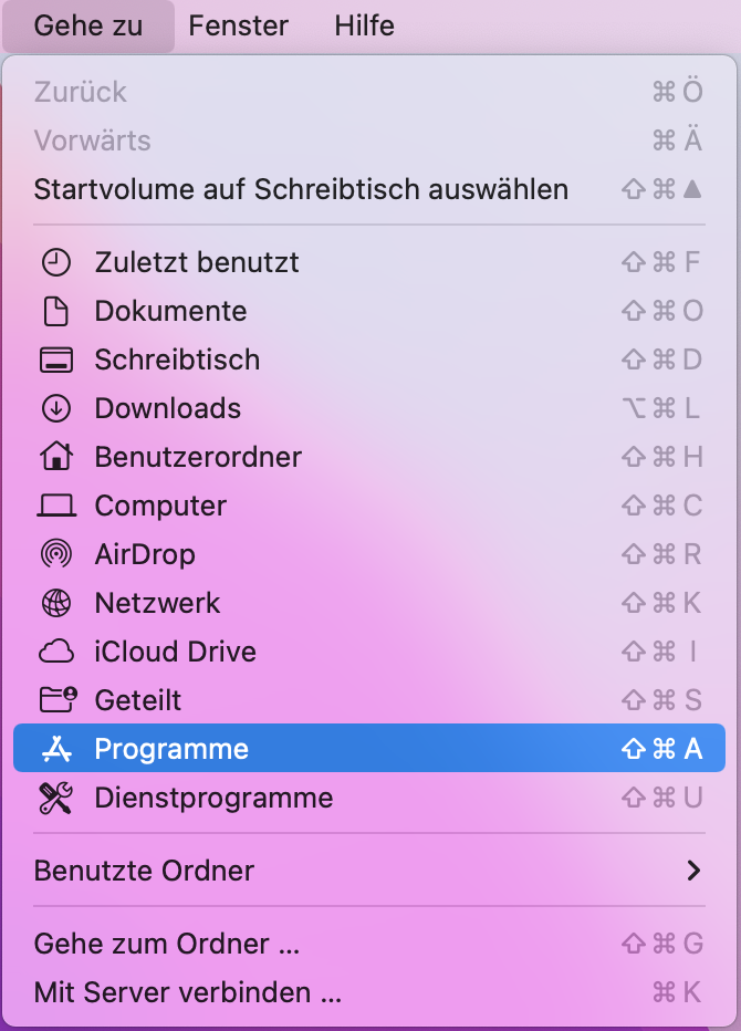 Klicken Sie in der Menüleiste auf Gehe zu und anschließend auf Programme.