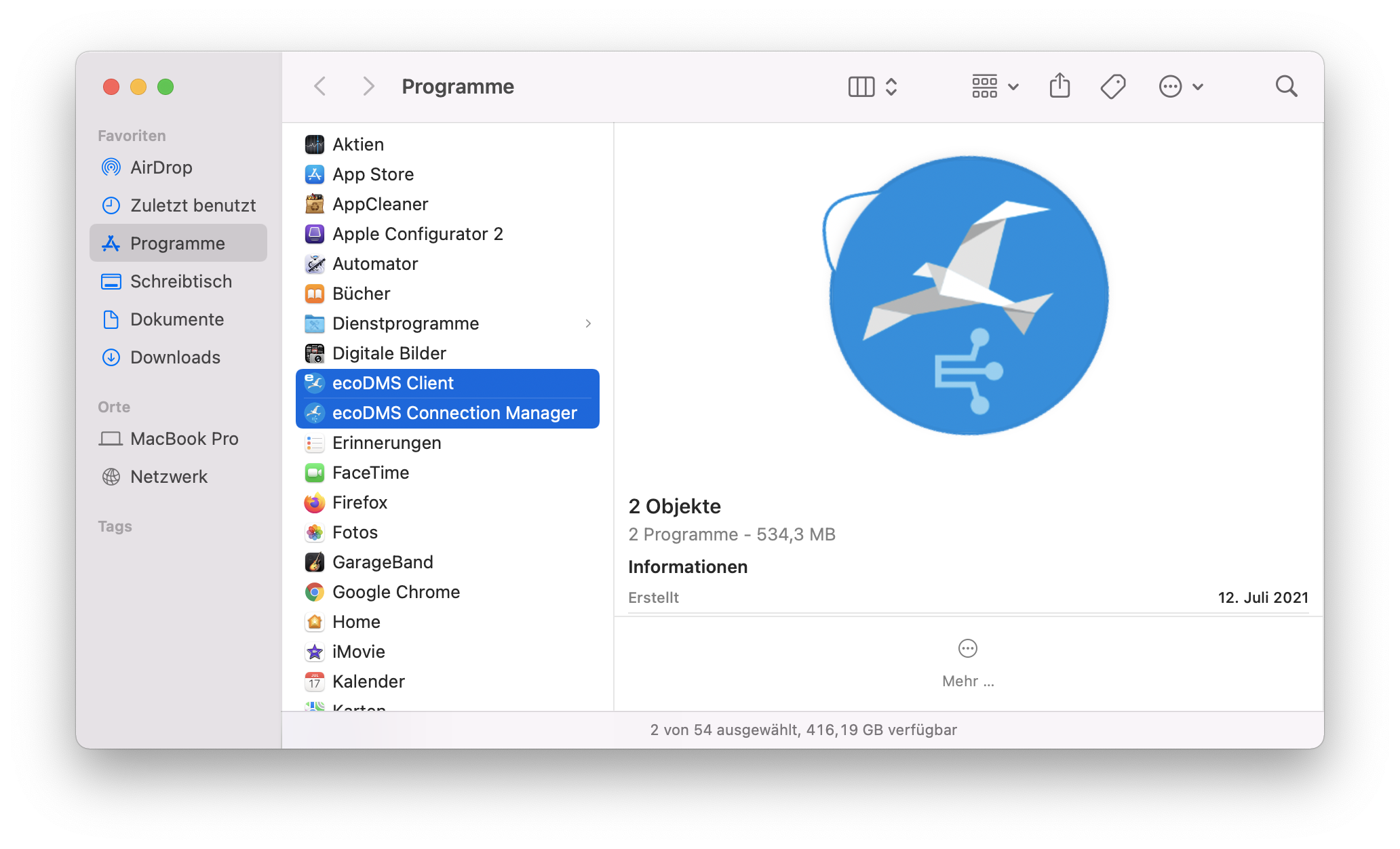 Danach suchen Sie die Anwendungen ecoDMS Client und ecoDMS Connection Manager und verschieben diese in den Papierkorb per Rechtsklick.