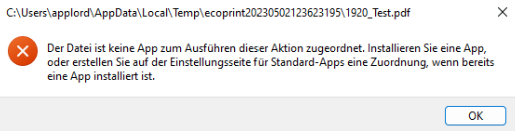 Unter Windows erscheint beim Drucken einer Datei aus ecoDMS heraus folgende Meldung: