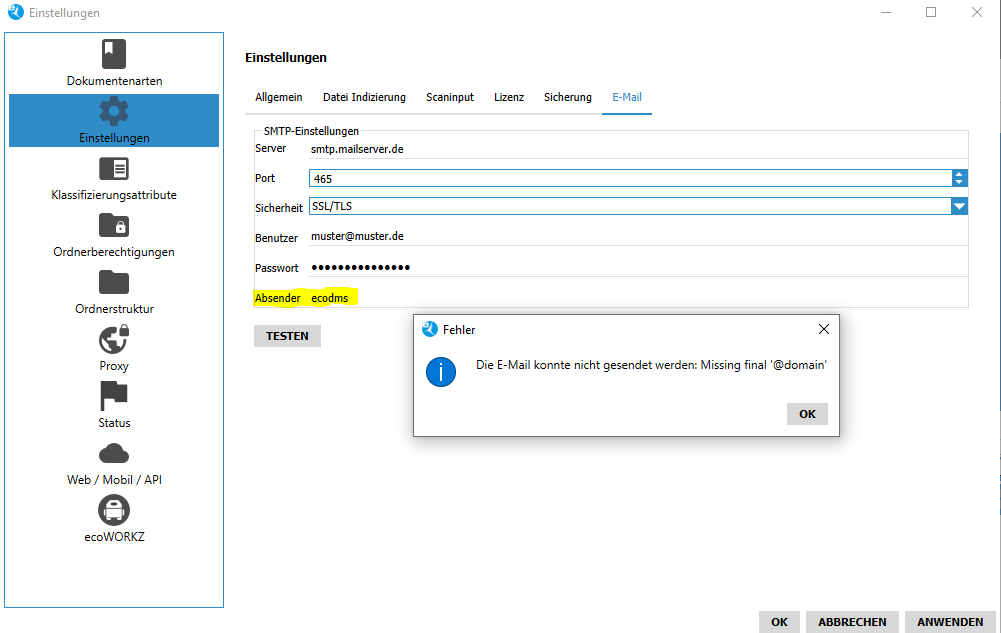 Bei der Konfiguration der SMTP-Einstellungen im Tab E-Mail erscheint folgende Meldung: