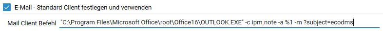 Deshalb kann hier optional eine Syntax zum Aufrufen eines beliebigen E-Mail Clients, der zum Versenden von Dokumenten aus ecoDMS verwendet werden soll, hinterlegt werden.