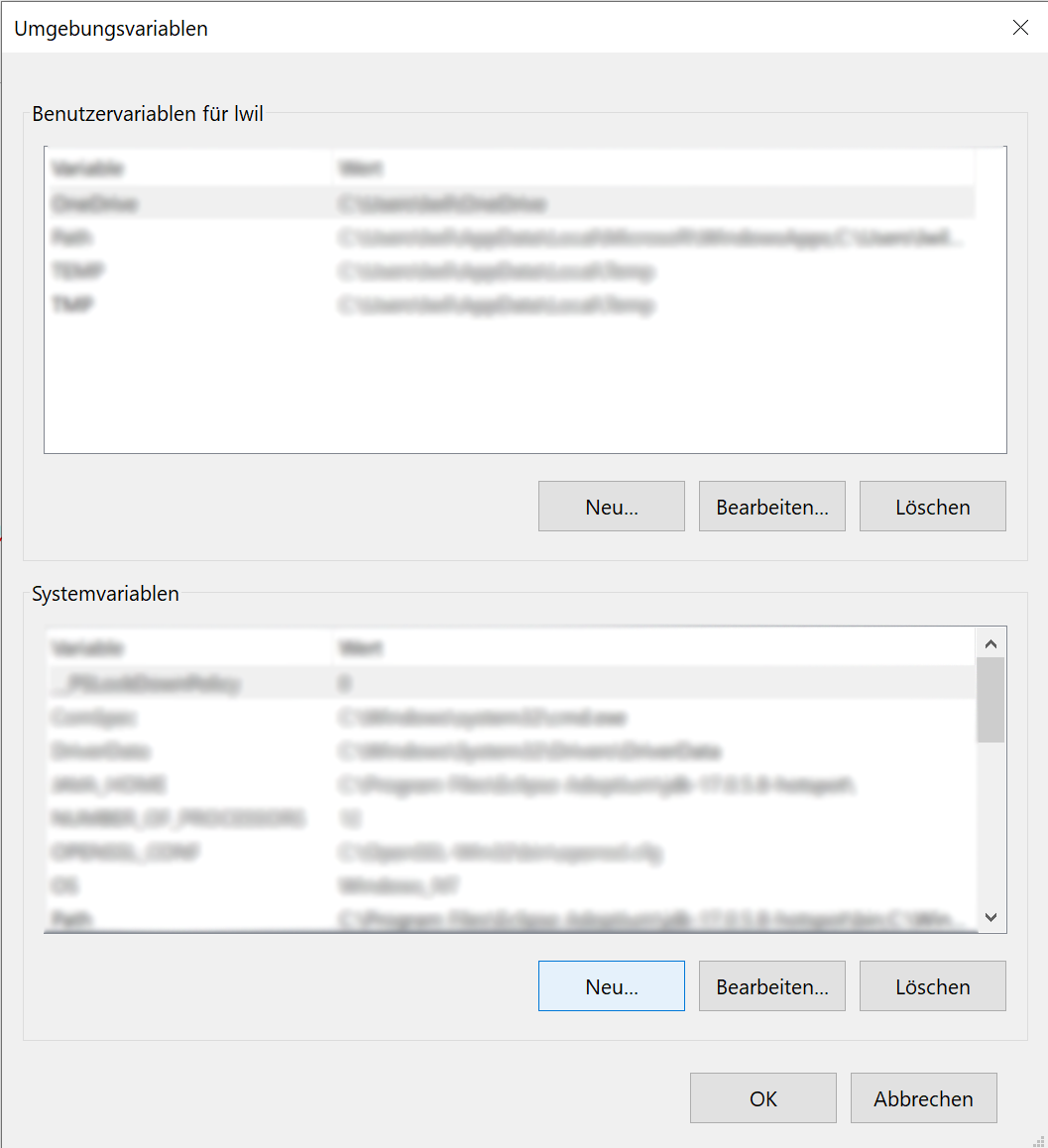 In den Umgebungsvariablen klicken Sie auf den Button Neu, der sich unter den Systemvariablen befindet.