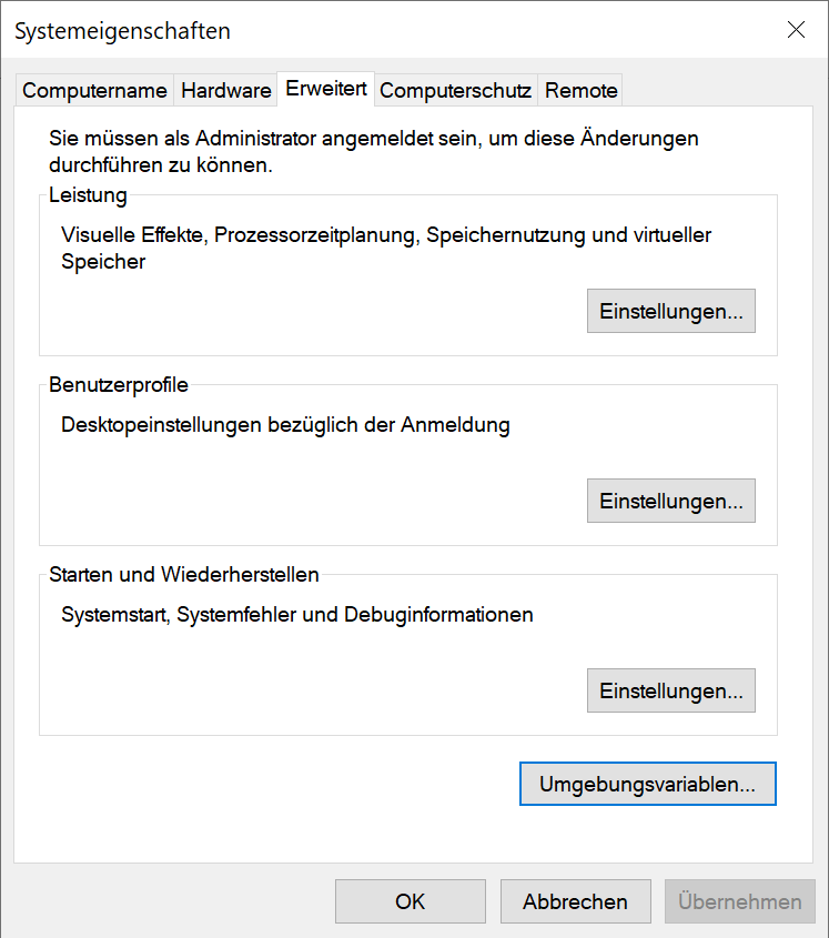 Es öffnet sich ein Fenster mit den Systemeigenschaften, klicken Sie hier auf Erweitert und danach auf Umgebungsvariablen.