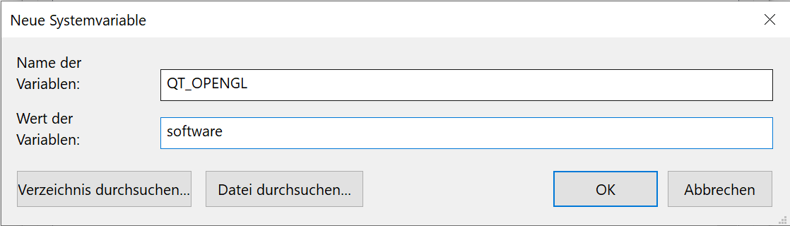 Ändern Sie die QT_OPENGL Einstellungen in den Systemvariablen: