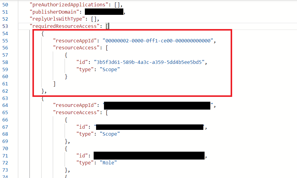 Scrollen Sie zu „requiredResourceAccess“ und fügen Sie das folgende hinzu: