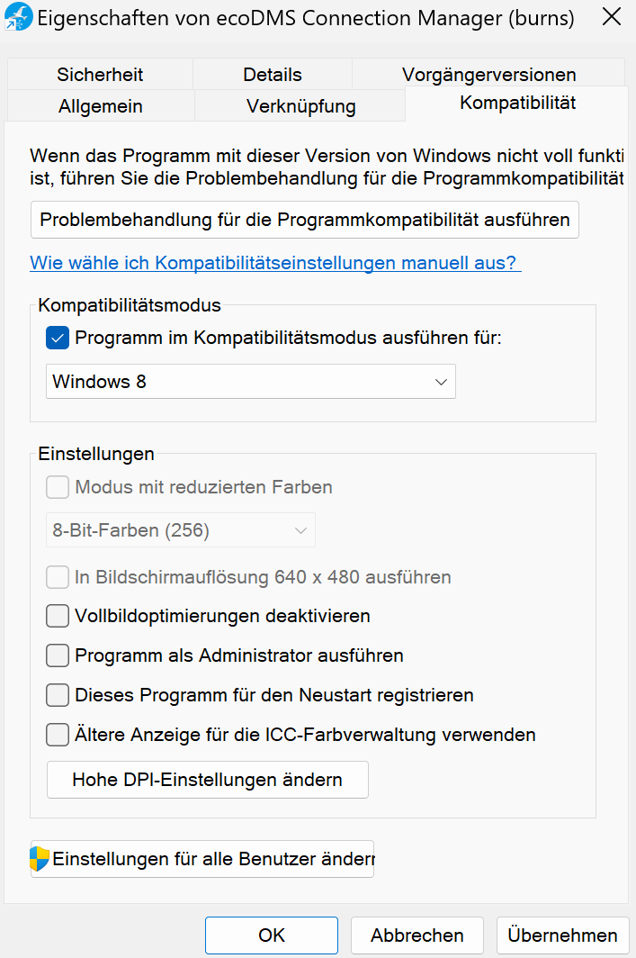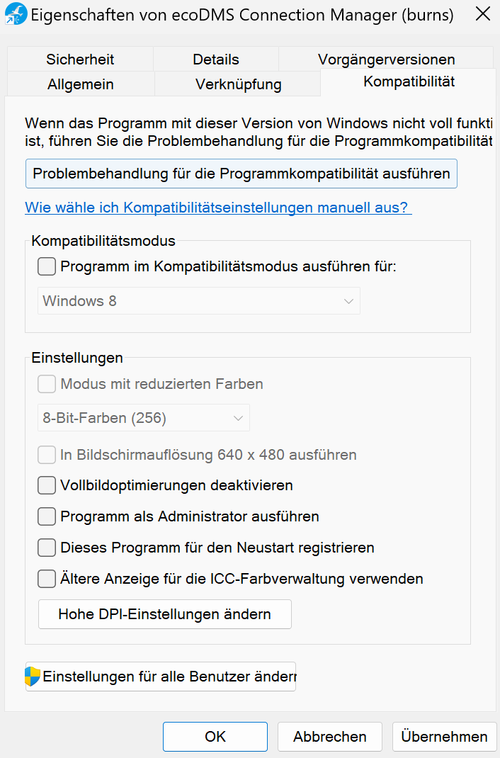 Connection Manager im Kompatibilitätsmodus ausführen
