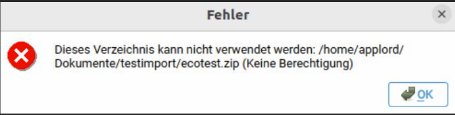 Erfolgt diese Berechtigung nicht erhalten Sie bei der Auswahl des Ordners in den Einstellungen zum Dateiimport folgende Fehlermeldung: