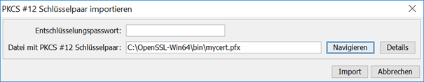 Datei mit PKCS #12 Schlüsselpaar - Navigieren - .pfx Datei wählen – Import