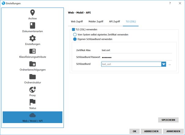 in ecoDMS bei "Schlüsselbund" (unter Einstellungen - Web/Mobil/API) die soeben gespeicherte .jks Datei auswählen.