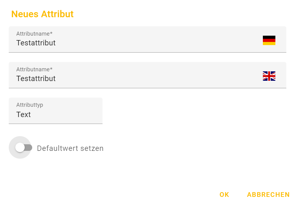 Tragen Sie hier den Attributnamen ein. Der deutschsprachige Attributname wird zunächst analog in die Fremdsprachenfelder übernommen und kann dort jederzeit angepasst werden.