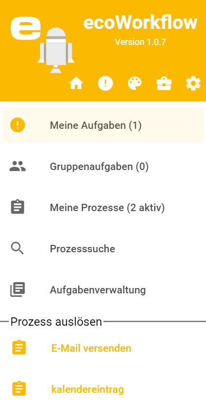 Unterhalb der Rubrik Prozess auslösen werden Ihnen alle Prozesse angezeigt die durch einen Benutzer ausgelöst werden können. Je nach Einstellung des Workflowprozess wird der jeweilige Prozess im Hintergrund ausgelöst oder aber es öffnet sich eine entsprechende Benutzeraufgabe, die vom Benutzer bearbeitet werden muss.