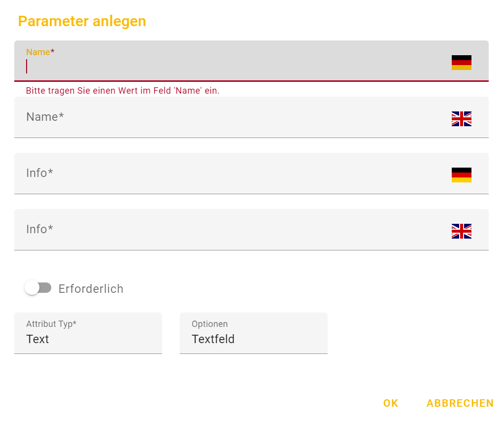 Erforderlich: Legen Sie mittels klick auf den Schieber fest ob dieser Parameter zwingend erforderlich ist. Ist der Schieber nicht aktiviert, dann muss das Attribut welches in dem Parameter festgelegt wurde nicht zwingend zur Ausführung der externen Aufgabe im Workflowprozess vorhanden oder mit Daten befüllt sein.