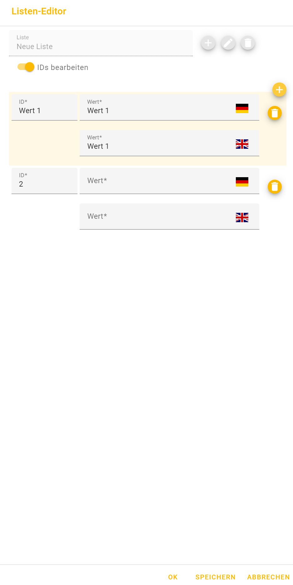 Zusätzlich haben Sie die Möglichkeit , mittels Aktivierung der Option IDs bearbeiten, die ID der einzelnen Listeneinträge anzupassen. Geschieht dies nicht, erhält die Liste eine fortlaufende Nummerierung. Wenn Sie alle Angaben hinterlegt haben speichern Sie diese über die entsprechende Schaltfläche. Anschließend verlassen Sie die Listenverwaltung mittels OK. Mit ABBRECHEN verwerfen Sie Ihre Angaben.