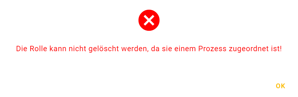 - Eine Rolle kann nur gelöscht werden, wenn diese keinem Prozess mehr zugewiesen ist. Sollte dies der Fall seine erhalten Sie eine entsprechende Hinweismeldlung: