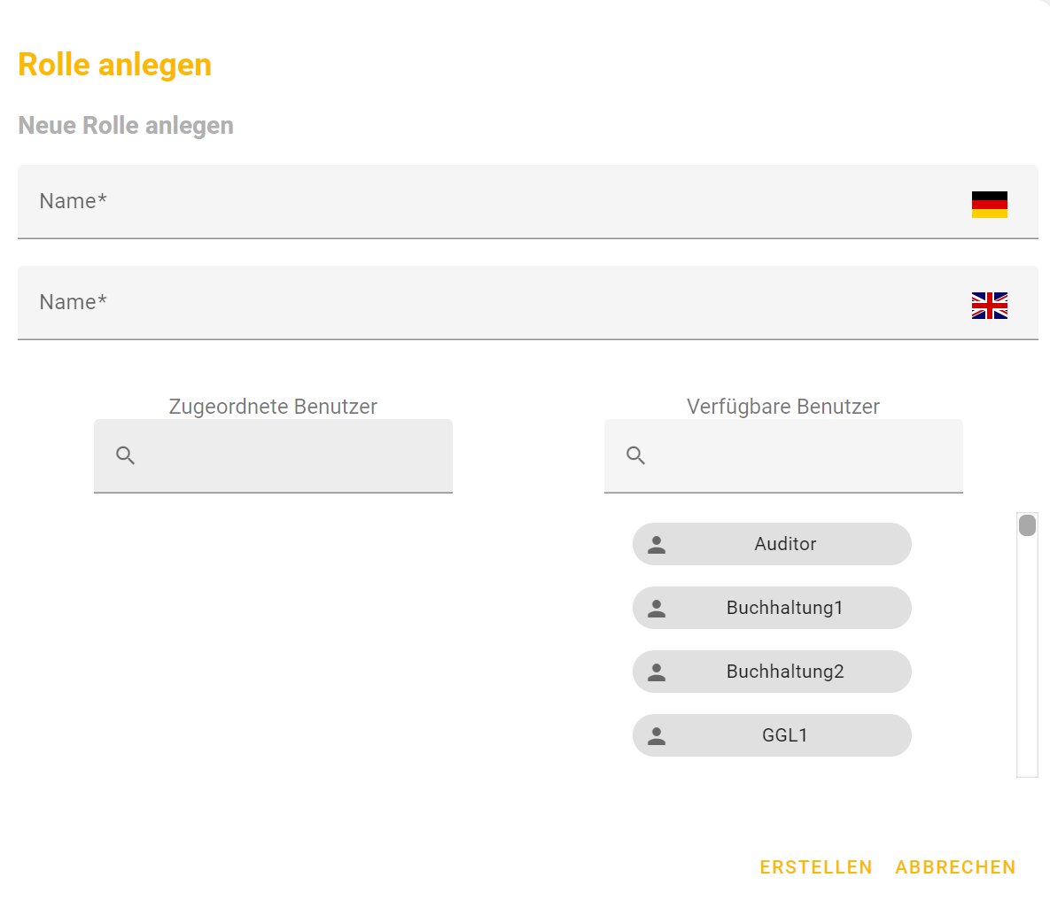 - Verfügbare Benutzer: Dieser Liste entnehmen Sie alle für die Rolle verfügbaren Benutzer. Über das Suchfeld können Sie einen/mehrere Benutzer suchen. Mittels klick auf einen Benutzer wird dieser in die Liste der zugeordneten Benutzer hinzugefügt.
