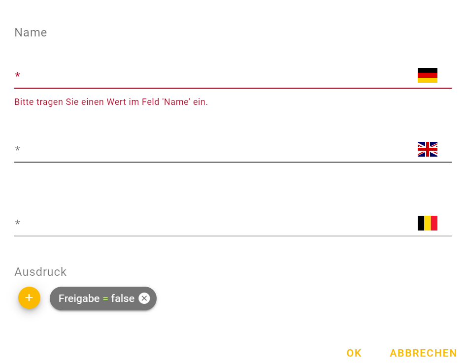 Tragen Sie hier den Namen des Start-Events ein. Der deutschsprachige Name wird zunächst analog in die Fremdsprachenfelder übernommen und kann dort jederzeit angepasst werden. Die Hinterlegung eines Namens ist nicht zwingend erforderlich.