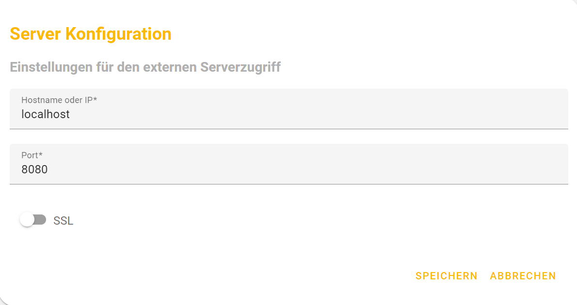 Diese Einstellungen beziehen sich auf den externen Serverzugriff. Hier legen Sie den Hostnamen/IP und den Port für den externen Zugriff auf ecoWorkflow fest. Des Weiteren können Sie den Zugriff per SSL-Verschlüsselung mittels klick auf den Schieber aktivieren. Anschließend Speichern Sie ihre Angaben mittels der entsprechenden Schaltfläche. Mittels Abbrechen verwerfen Sie Ihre Angaben.