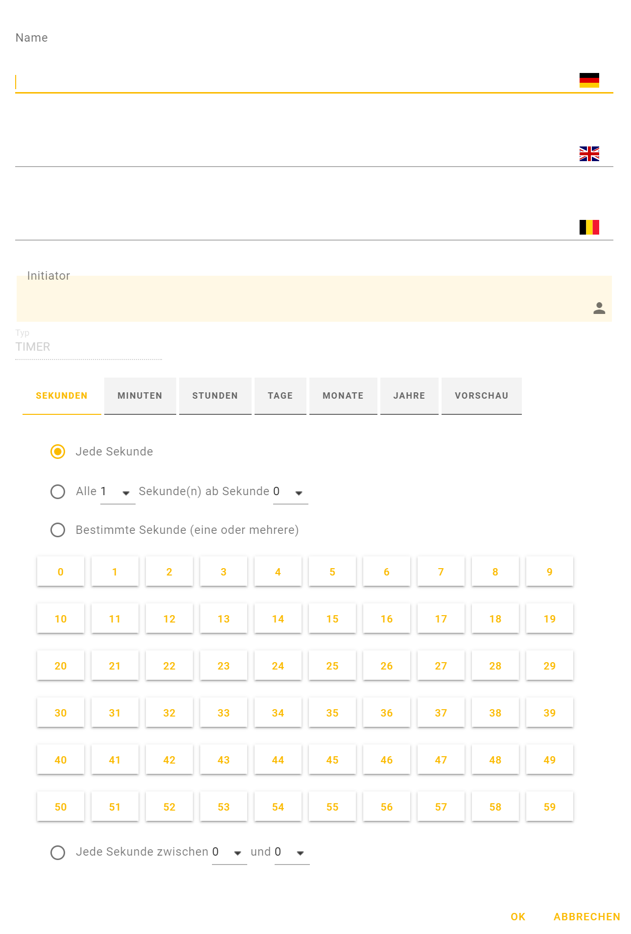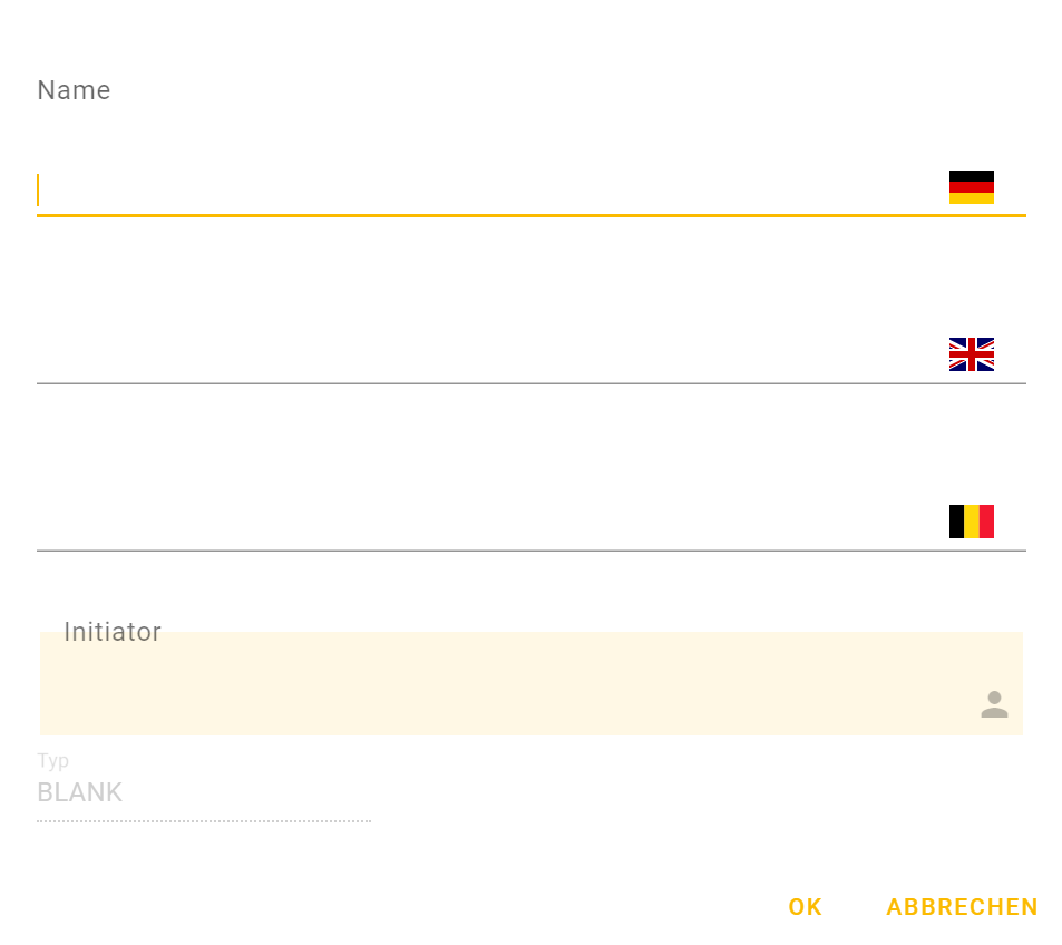 Tragen Sie hier den Namen des Start-Events ein. Der deutschsprachige Name wird zunächst analog in die Fremdsprachenfelder übernommen und kann dort jederzeit angepasst werden. Die Hinterlegung eines Namens ist nicht zwingend erforderlich. Des Weiteren haben Sie hier die Möglichkeit einen Initiator zu hinterlegen, d.h. ein Attribut auf das der Auslöser des Prozesses gemappt werden soll. Hierbei handelt es sich um ein Benutzer-Attribut.