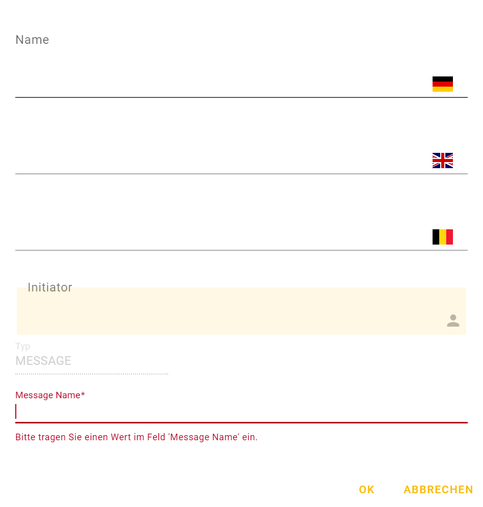 Tragen Sie hier den Namen des Start-Events ein. Der deutschsprachige Name wird zunächst analog in die Fremdsprachenfelder übernommen und kann dort jederzeit angepasst werden. Die Hinterlegung eines Namens ist nicht zwingend erforderlich. Des Weiteren müssen Sie den entsprechenden Message Name eintragen der das Event auslöst. Bitte beachten Sie, dass es innerhalb des Modells kein anderes Start-Event mit dem gleichen Message Name geben darf.