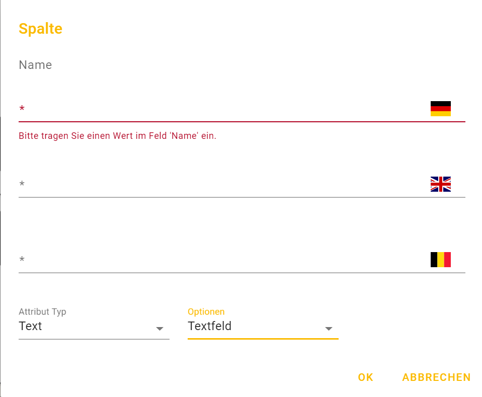 Mehr zu den Attributtypen und den Optionen entnehmen Sie den Kapiteln Attribute und Einstellungen Attribute. Sie können beliebig viele Spalten anlegen. Anschließend speichern Sie Ihre Angaben mittels der Schaltfläche OK. Mit ABBRECHEN verwerfen Sie Ihre Angaben.
